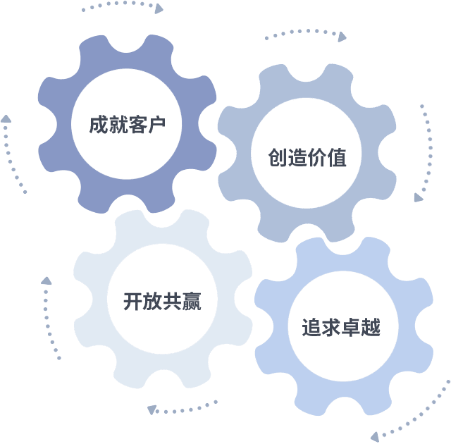 成就客户是一切决策的出发点,,,,创造价值是衡量所有工作的标准,,追求卓越是我们做事做人的态度,,开放共赢是我们的格局也是最终的结果。。价值观的齿轮环环相扣,,推动着组织里的每个人不断向前。。。